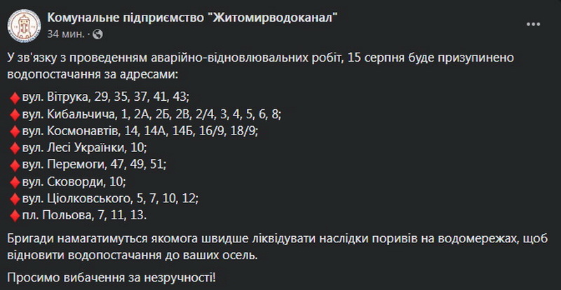 Скриншот зі сторінки у Facebook КП «Житомирводоканал»
