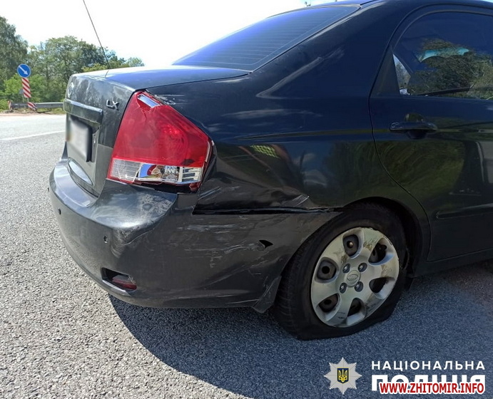 На автошляху Київ-Чоп зіштовхнулись легковик та мотоцикл: поліція з’ясовує обставини. Дорожньо-транспортна пригода сталася 14 серпня близько 13:10, неподалік с. Березівки Житомирського району. На 156 км автошляху Київ-Чоп зіштовхнулись автомобіль «KIA Cerato», під керуванням 63-річного жителя Донеччини, та мотоцикл «Honda РС32».
