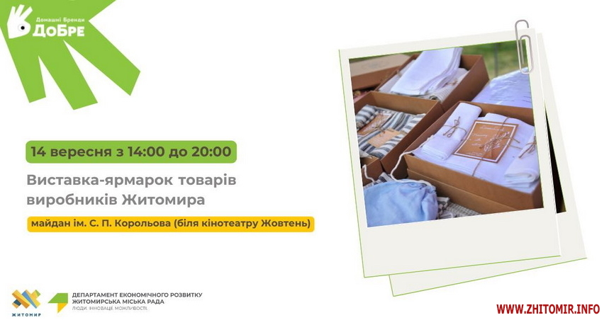 Житомирських підприємців запрошують взяти участь у виставці-ярмарку місцевих брендів, яка відбудеться 14 вересня на майдані ім. С. П. Корольова.