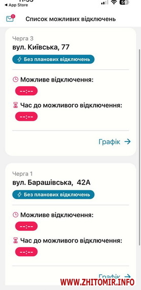 - відслідковувати графік погодинних відключень електроенергії по кожній збереженій локації.