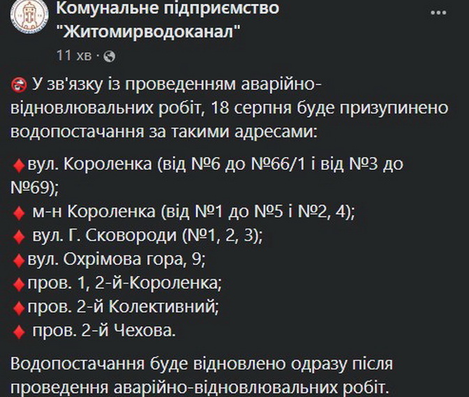 Скриншот зі сторінки у Facebook КП «Житомирводоканал»
