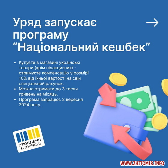 Кабінет міністрів на засіданні 20 серпня 2024 року затвердив порядок надання грошової допомоги українцям «Національний кешбек»: громадяни отримуватимуть компенсацію 10% вартості куплених ними українських товарів. Програма запрацює 2 вересня 2024 року.