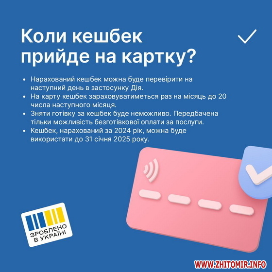 Накопичені за місяць кошти приходитимуть на створену картку раз на місяць до 20 числа наступного місяця. Наприклад, кешбек за товари, придбані в вересні, прийде на рахунок до 20 жовтня. Зняти готівку з рахунку, куди нараховують кошти за кешбек, буде неможливо. Використати кошти від кешбеку, нараховані в 2024 році, можна буде до 31 січня 2025 року.