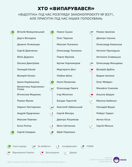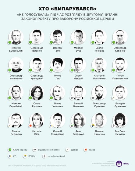 Рух ЧЕСНО зауважує, що 74 народних депутати «випарувались» і не підтримали урядовий законопроєкт про заборону «московської церкви» у другому читанні та в цілому, водночас ці нардепи голосували «за» розгляд інших питань порядку денного на засіданні Верховної Ради у вівторок, 20 серпня, або ж «не голосували» (картка в слоті, але жодні дії не відбуваються).
