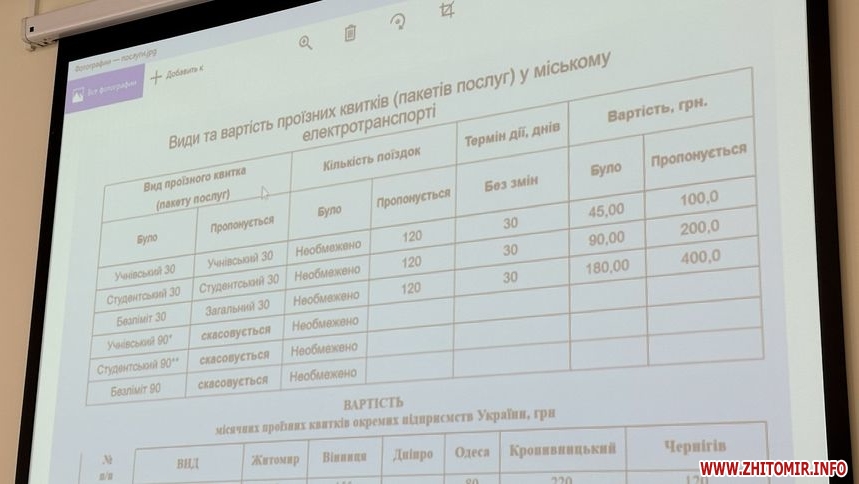 «Інформуємо, що з 2020 року в нас не підіймалась я вартість проїзних квитків – пакети послуг. У нас з того часу відбулися збільшення вартості проїзду по транспортній картці з 4 до 8 гривень. Враховуючи значну збитковість для нашого комунального підприємства у даних проїзних квитків, як управління, ми виносимо пропозиції щодо збільшення їх вартості та встановити ліміт поїздок. Пропонуються такі зміни: По учнівському квитку пропонується встановити – 100 грн замість 45 грн, кількість поїздок – 120 одиниць. Вартість 1 поїздки 80 копійок виходить. Студентський квиток – 200 грн. Один загальний 30 днів для всіх громадян 120 поїздок – це 400 грн, якщо користуватися, тоді вийде 3 грн 30 коп. одна поїздка буде коштувати», – говорить в.о. начальника управління транспорту і зв’язку Житомирської міськради Микола Єрмаков.