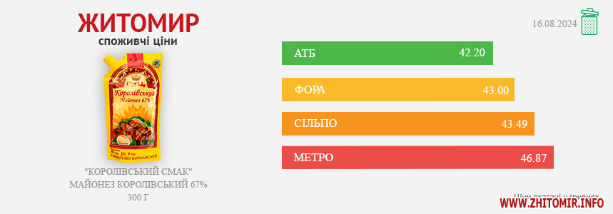 Моніторинг здійснено на основі інформації, отриманої за методом контрольної закупки 16.08.2024 р. у місцях продажу: АТБ, пр. Миру, 15 А, Фора, вул. Лятошинського, 2, Метро, вул. Ватутіна, 55-в, Сільпо, вул. Житній ринок, 1