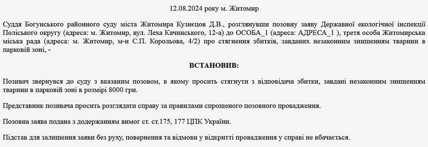 «Позивач звернувся до суду з вказаним позовом, в якому просить стягнути з відповідача збитки, завдані незаконним знищенням тварини в парковій зоні в розмірі 8000 грн», - йдеться в ухвалі.