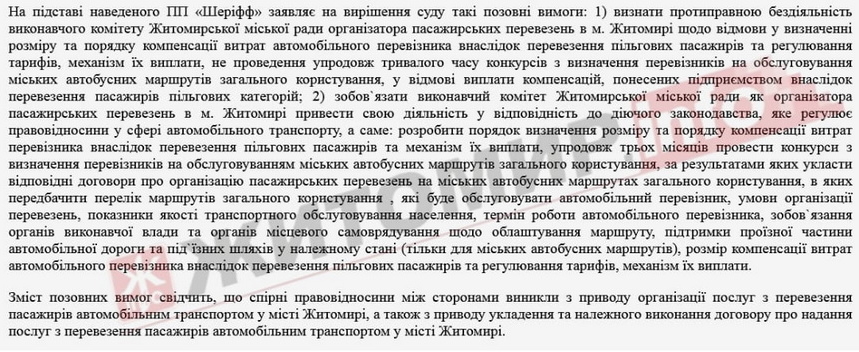 «Виконавчий комітет Житомирської міської ради як організатор пасажирських перевезень умісті Житомирі з січня 2022 року по теперішній час не провів жодного конкурсу з визначення автомобільного перевізника для організації пасажирських перевезень в місті, не уклав жодного договору про надання права на такі перевезення. ПП «Шеріфф» здійснює перевезення пасажирів за міськими автобусними маршрутами на підставі тимчасових договорів, які укладаються зі структурним підрозділом виконавчого комітету Житомирської міської ради Управлінням транспорту та зв`язку. На думку позивача, такі тимчасові договори є нікчемними, адже не передбачені жодним законодавчим актом. Управління транспорту та зв`язку Житомирської міської ради не наділене повноваженнями щодо виконання функцій організатора пасажирських перевезень. Аналіз діючих тимчасових договорів на перевезення пасажирів свідчить про їх дискримінаційний характер щодо перевізника, оскільки не містить зобов`язання організатора відшкодувати кошти за пільгове перевезення, тоді як ПП «Шеріфф» не може відмовити у перевезенні пасажирів пільгової категорії. 10 червня 2024 року ПП «Шеріфф» письмово звернулось до органу місцевого самоврядування щодо роз’яснень причин не проведення конкурсів на визначення перевізників для організації пасажирських перевезень у м. Житомирі та з пропозицією укласти додаткові угоди до діючих договорів, якими передбачити компенсаційні виплати за перевезення підприємством пасажирів пільгових категорій. Листом від 18 липня 2024 року виконавчий комітет Житомирської міської ради повідомив про відсутність підстав для укладення додаткових угод», - йдеться в ухвалі суду.