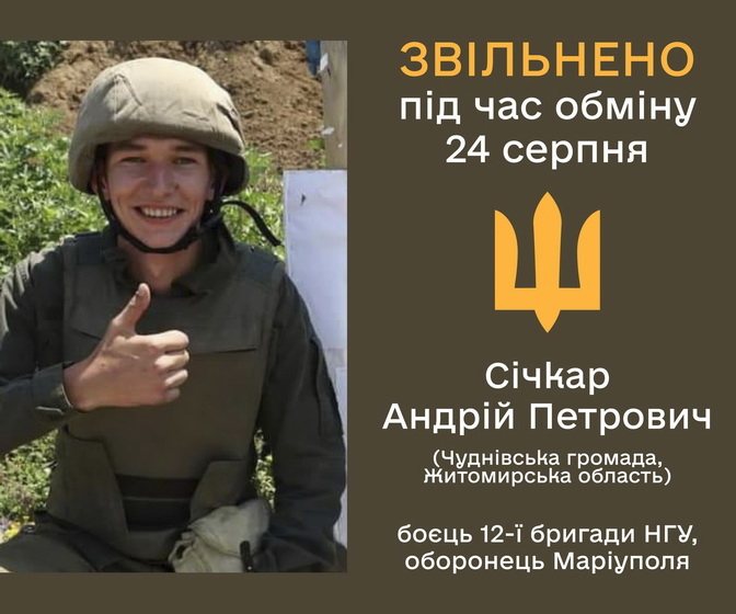 Зазначимо, експрессекретар начальника Житомирської ОВА Юрій Мельник 24 серпня повідомив, що з полону повернувся житель Чуднівської громади, боєць 12-ї бригади НГУ Андрій Петрович Січкар.