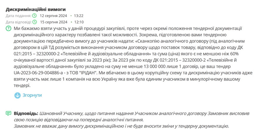 Відразу після оприлюднення інформації про закупівлю замовнику почали надсилати скарги на дискримінаційні вимоги, але відповідь департаменту освіти на кожну скаргу закінчувалася однаково: «Замовник не вважає дану вимогу дискримінаційною і не буде вносити зміни у тендерну документацію».