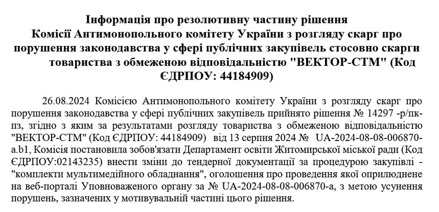 Зрештою київське ТОВ «Вектор-СТМ» 13 серпня направило скаргу до Антимонопольного комітету щодо дискримінаційних вимог тендерної документації департаменту освіти Житомирської міської ради. 26 серпня АМКУ ухвалив рішення, яким зобов’язав департамент освіти внести зміни до тендерної документації.