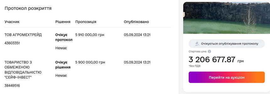 Переможцем аукціону з пропозицією 5 млн 910 тис. грн стало ТОВ «Агромехтрейд»: зареєстроване в Рівному у 2020 році, статутний капітал – 3 млн грн, основний вид діяльності – добування мінеральної сировини для хімічної промисловості та виробництва мінеральних добрив, власник і керівник – Богельський Ярослав Олександрович.