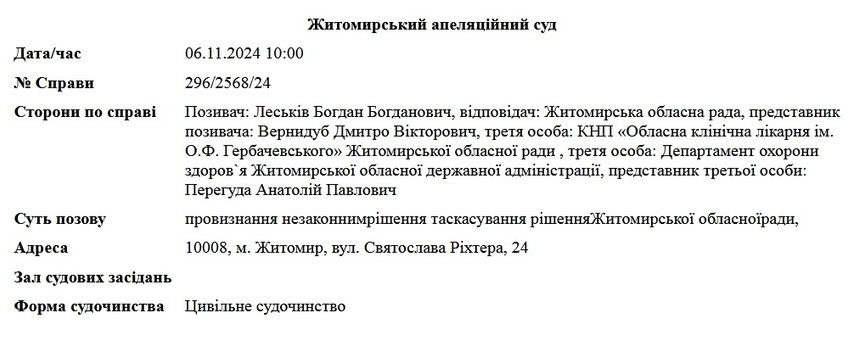 Нагадаємо, Житомирська обласна рада на сесії 7 березня цього року ухвалила рішення про звільнення Богдана Леськіва з посади генерального директора КНП «Обласна клінічна лікарня ім. О.Ф. Гербачевського»: за це проголосували 38 депутатів з 51 присутнього (всього в облраді 64 депутати). 22 березня Корольовський районний суд м.Житомира отримав позов Богдана Леськіва до Житомирської обласної ради щодо визнання незаконним та скасування рішення облради. Рішенням від 16 липня 2024 року Корольовський районний суд м.Житомира відмовив у задоволенні позову Богдана Леськіва. Зараз справа розглядається в апеляційній інстанції, чергове засідання призначене на 6 листопада 2024 року.