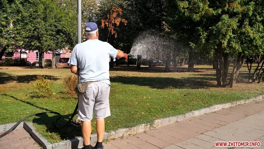 «Зеленбуд сьогодні обслуговує більш як 100 об'єктів у Житомирі, з них 49 об'єктів – сквери. З 49 скверів, 10 має автоматичний полив, 4 сквери мають ручний полив і 35 скверів обслуговуються виключно поливною машиною. Якщо ми говоримо про всі зелені зони у Житомирі, то цим займається не тільки КП «Зеленбуд», а й інші підприємства, комерції, бюджетні установи. Тому, це питання до усіх в Житомирі. Чому по деяких ділянках трава не покошена та жовта, деякі клумби, які не належать комерції, в неналежному стані? Це питання до всіх нас у Житомирі», – говорить заступник Житомирського міського голови Сергій Кондратюк.