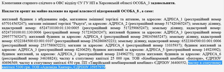 Одну зі співвласниць ТОВ, мешканку м.Скадовськ Херсонської області Булюк Олену Валеріївну, яка має частку 10% (5300 грн), підозрюють у скоєнні кримінального правопорушення, передбаченого ч. 4 ст. 111-1 КК України (Колабораційна діяльність). Ухвалою Заводського районного суду міста Миколаєва від 28 серпня 2024 року накладено арешт на майно, яка належить підозрюваній, в тому числі – на частку в статутному капіталі 5300 грн ТОВ «Аделаїда Хантер».