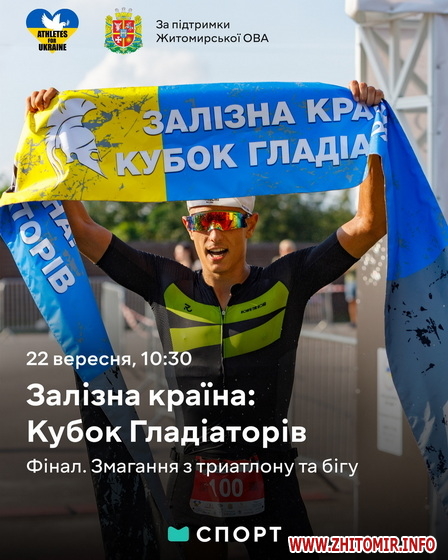 «Дивися фінал міжнародних благодійних змагань «Залізна Країна: Кубок Гладіаторів». Вже в неділю о 10:30 в Житомирі розпочнеться фінал «Кубка Гладіаторів» з тріатлону та бігу. І попереду на нас чекають запеклі змагання! В межах змагань з тріатлону учасники долатимуть Олімпійську дистанцію — 1,5 км плавання, 40 км вело та 10 км бігу. Також будуть бігові дистанції: 5, 10 та 21 км. Скандинавська хода – 5 км та розважальні дистанції для дітей та дорослих. Подія буде доступна до перегляду наживо на MEGOGO та відбувається за підтримки Житомирської обласної військової адміністрації та Житомирської міської ради», - йдеться в дописі.