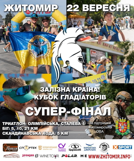У Житомирі 22 вересня проведуть суперфінал кубка з тріатлону «Залізна країна: Кубок гладіаторів». Під час благодійного заходу, як і торік, збиратимуть кошти для житомирського військового шпиталю та перекриватимуть рух транспорту деякими вулицями обласного центру.