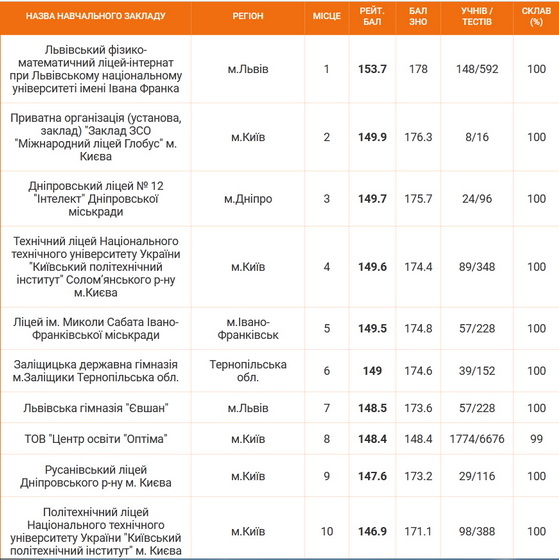 Школи України в таблиці ранжовані за рейтинговим балом, який розрахований на підставі середнього значення балів національного мультипредметного тесту, отриманих учасниками тестування з усіх предметів НМТ та з урахуванням загальної кількості складених тестів випускниками кожної школи.