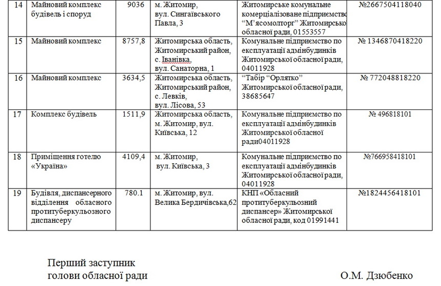 У додатку, який останні раз змінювали в серпні 2023 року, додавши приміщення готелю «Україна» на вул.Київській, 3 у Житомирі, з’явився ще один об’єкт: будівля диспансерного відділення обласного протитуберкульозного диспансеру площею 780,1 кв.м за адресою: м. Житомир, вул. Велика Бердичівська, 62.