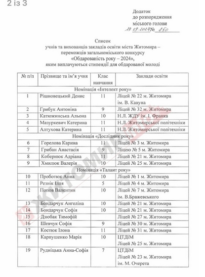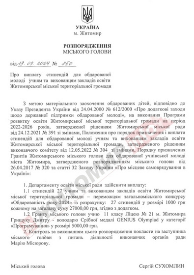 «3 метою матеріального заохочення обдарованих дітей…Департаменту освіти здійснити виплату стипендій 27 учням та вихованцям закладів освіти Житомирської міської територіальної громади — переможцям загальноміського конкурсу «Обдарованість року-2024» із розрахунку: 27 стипендій у розмірі 1000 грн кожному на загальну суму 27000,00 грн, згідно з додатком», - зазначено в документі.