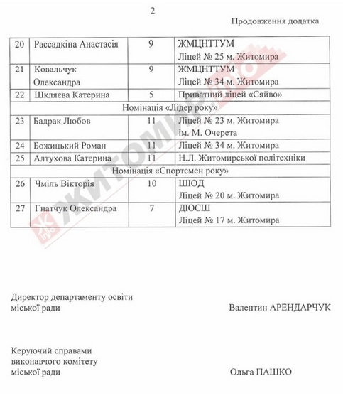 «Гранту міського голови учню 11 класу Ліцею Nº 21 м. Житомира Грищуку Дмитру — володарю Срібної медалі GENIUS Olympiad у категорії «Програмування» у розмірі 5000,00 гривень», - йдеться у розпорядженні.