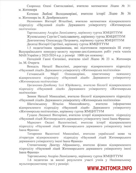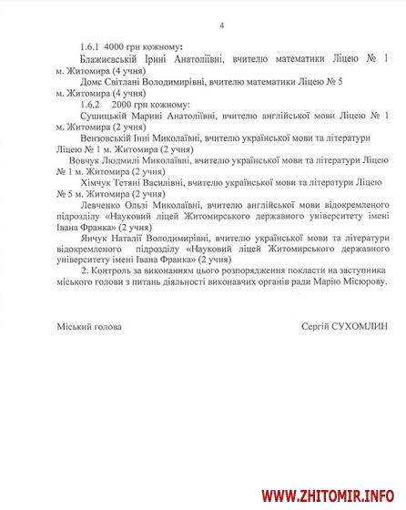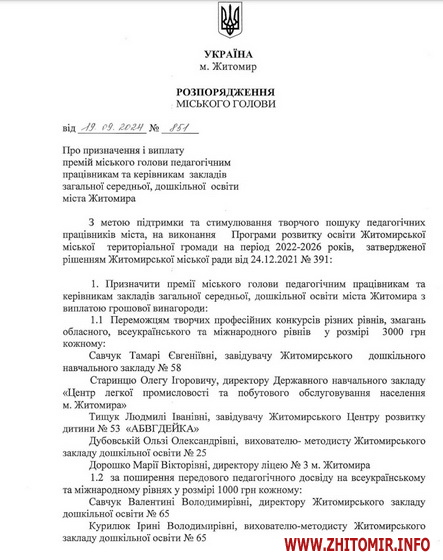 Розпорядження про призначення і виплату премій міського голови педагогічним працівникам та керівникам закладів загальної середньої, дошкільної освіти міста Житомира Сергій Сухомлин підписав 19 вересня 2024 року.