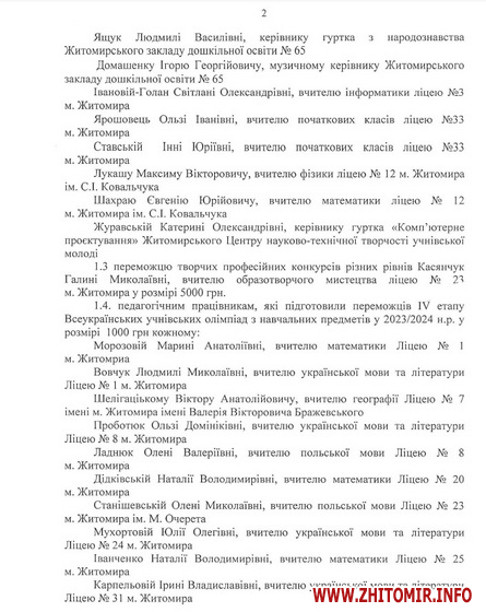«З метою підтримки та стимулювання творчого пошуку педагогічних працівників міста, на виконання Програми розвитку освіти Житомирської міської територіальної громади на період 2022-2026 років» - йдеться в розпорядженні.