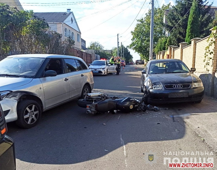 «Дорожньо-транспортна пригода сталася 28 вересня на вулиці Святослава Ріхтера. На місці події працювала слідчо-оперативна група Житомирського райуправління поліції. Попередньо, близько 14:55 відбулося зіткнення автомобіля «Mitsubishi» під керуванням 39-річного місцевого жителя та мотоцикла «Ducati», який рухався у зустрічному напрямку. Після цього двоколісник продовжив рух та зіткнувся з зустрічним легковиком «Skoda» та припаркованим «Audi», - йдеться в інформації.