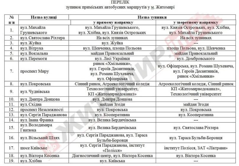 Нагадаємо, попередній перелік зупинок у Житомирі приміських автобусів погодили на засіданні міськвиконкому 19 грудня 2012 року, в ньому були передбачені кілька зупинок під час руху по Київській та Великій Бердичівській.