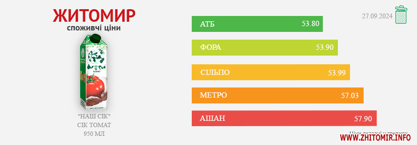 Моніторинг здійснено на основі інформації, отриманої за методом контрольної закупки 27.09.2024 р. у місцях продажу: АТБ, пр. Миру, 15А, Фора, вул. Лятошинського, 2, Метро, вул. Ватутіна, 55-в, Сільпо, вул. Житній ринок, 1, Ашан, вул. Київська, 77