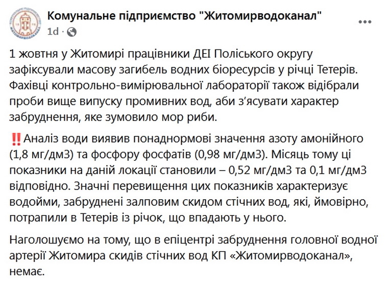 Повідомлення КП «Житомирводоканал», оприлюднене вдень 3 жовтня