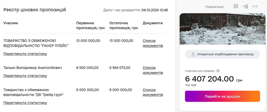 Переможцем аукціону стало ТОВ «Пауер Плейс» (Київ) з пропозицією 13 млн грн, що вдвічі більше стартової ціни.