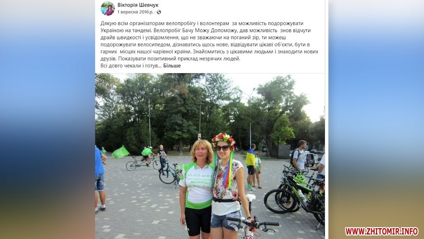 Вікторія Шевчук із Житомира народилась з вродженою катарактою, а згодом майже повністю втратила зір. Попри всі труднощі жінка веде активний спосіб життя: підйом на Говерлу, літання з парашутом, їзда верхи на коні, велопробіг, плавання з дельфінами та багато іншого – все це здійснила Вікторія.