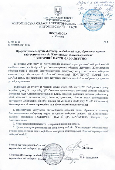На сайті оприлюднена постанова обласної ТВК від 10 жовтня 2024 року про визнання обраним депутатом Житомирської обласної ради наступного за черговістю кандидата в депутати в єдиному багатомандатному виборчому окрузі від Житомирської обласної організації політичної партії «За майбутнє».