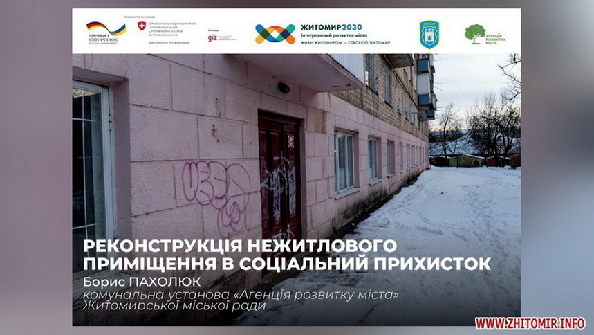У Житомирі за грантові кошти від уряду Німеччини облаштували соціальний гуртожиток для внутрішньо переміщених осіб за адресою вул. Отаманів Соколовських, 7 і зараз працюють над створенням соціального прихистку за адресою вул. Домбровського, 16-а.