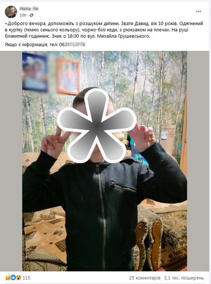 Зауважимо, що допис про зникнення 10-річного хлопчика оприлюднили в одній з житомирських Facebook-спільнот 17 жовтня близько 23:30, станом на ранок 18 жовтня публікація мала понад 3,2 тисячі поширень.