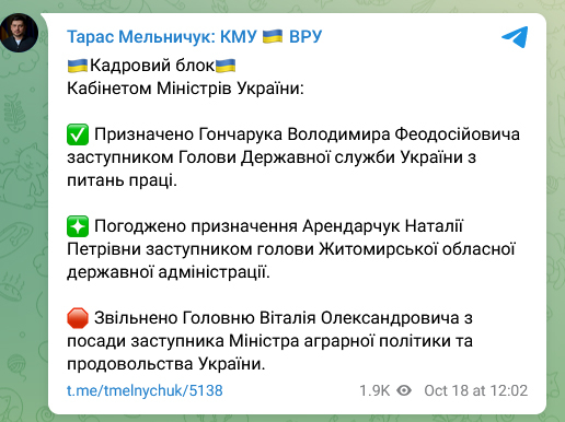 Про це 18 жовтня повідомив постійний представник Кабінету міністрів України у Верховній раді Тарас Мельничук в інформації про кадровий блок питань, ухвалених на засіданні Уряду.