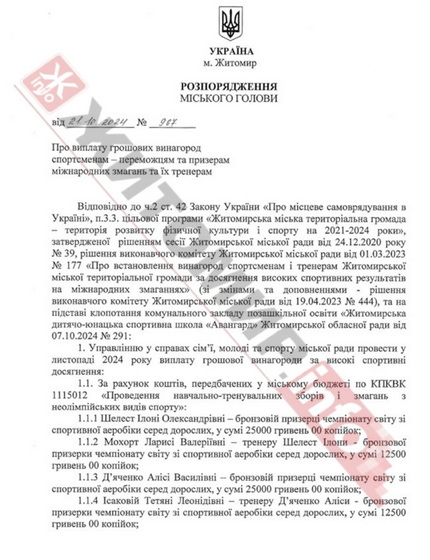 Відповідне розпорядження 21 жовтня підписала виконувачка обов’язків Житомирського міського голови Галина Шиманська. Документ, у якому йдеться про присвоєння стипендій спортсменкам та тренеркам, опублікований на сайті міськради.