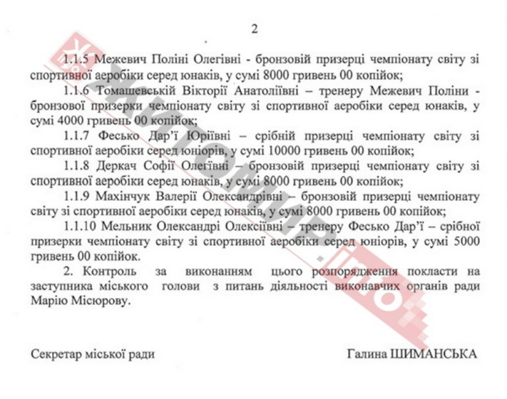 2.Мохорт Ларисі Валеріївні — тренеру Шелест Ілони — бронзової призерки чемпіонату світу зі спортивної аеробіки серед дорослих, у сумі 12500 гривень;