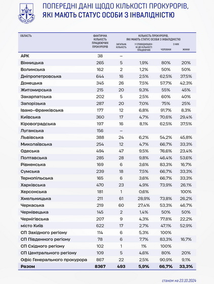 Оприлюднені попередні дані щодо прокурорів, які мають статус осіб з інвалідністю станом на 23 жовтня 2024 року. Зокрема, у Житомирській області із 215 фактично працюючих прокурорів 20 мають інвалідність (9,3%), з них 11 чоловіків і 9 жінок.