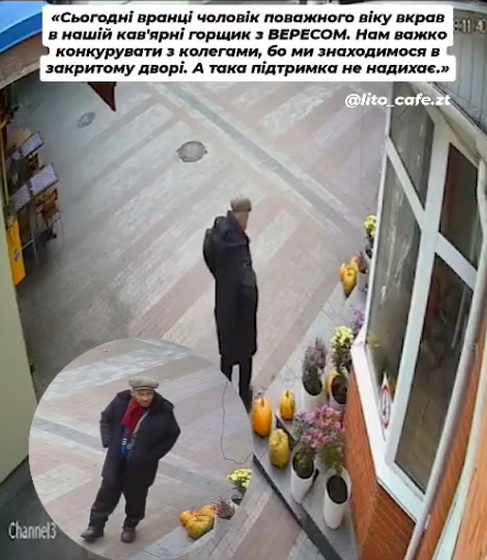 «Сьогодні о 7:10 чоловік поважного віку вкрав в нашій кав’ярні горщик з вересом», - йдеться у дописі.