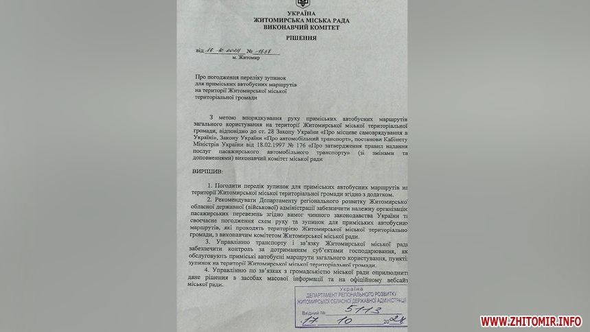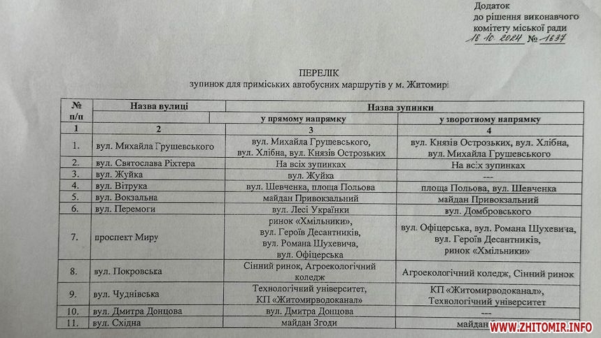 Як повідомляв Житомир.info, 1 жовтня 2024 року на сайті Житомирської міської ради був оприлюднений проєкт рішення про погодження переліку зупинок для приміських автобусних маршрутів на 19 вулицях, на двох центральних – Київській та Великій Бердичівській – зупинки приміських маршруток не передбачалися. 2 жовтня під час засідання виконкому питання зняли з розгляду «для доопрацювання». Необхідність зміни переліку зупинок для приміських маршруток 8 жовтня пояснював заступник мера Житомира Олександр Шевчук.
