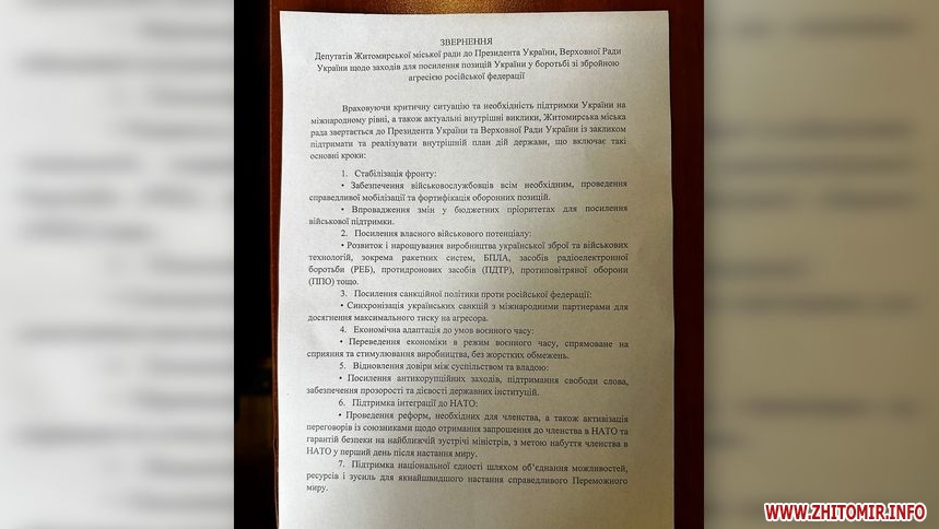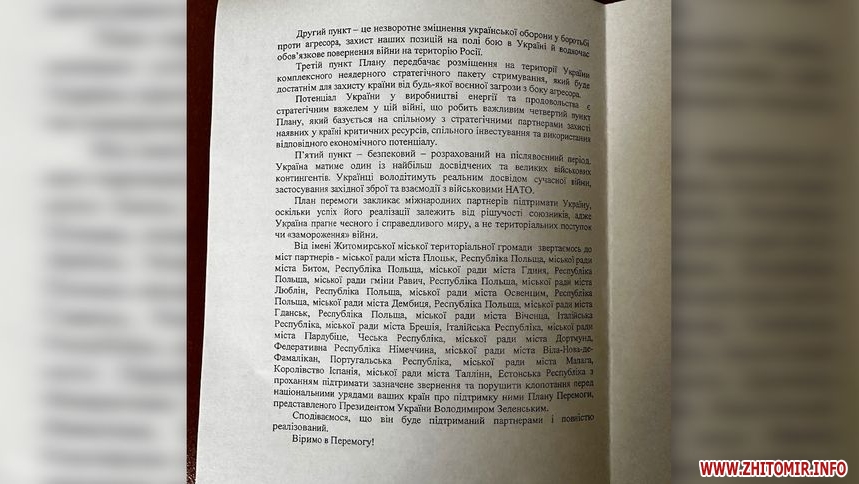 Як повідомляв Житомир.info, 16 вересня 2024 року президент України Володимир Зеленський у Верховній раді представив План перемоги, який складається з п’яти основних пунктів. 31 жовтня відбулася позачергова сесія Житомирської обласної ради, яку скликали заради одного питання – звернення про підтримку Плану перемоги.