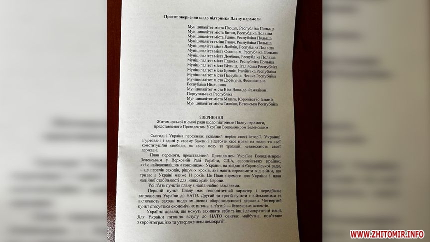 Депутати Житомирської міської ради підтримують План перемоги, який представив президент України. Свою позицію вони виклали у зверненні, яке надішлють Володимиру Зеленському, Верховній Раді та містам-побратимам.