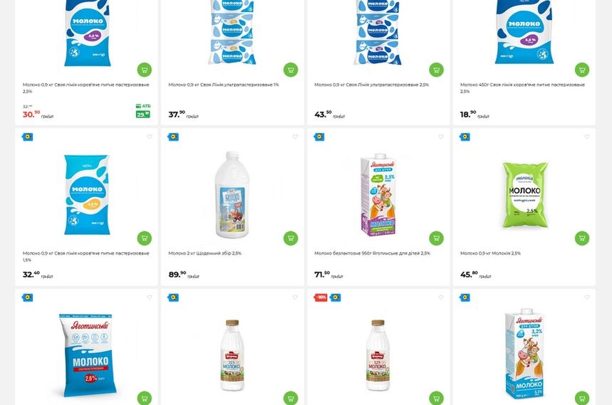 Дані взяті на сайті двох супермаркетів 5 листопада 2024 року. Отже, найнижча ціна за 900 мл молока 30 грн 90 коп.