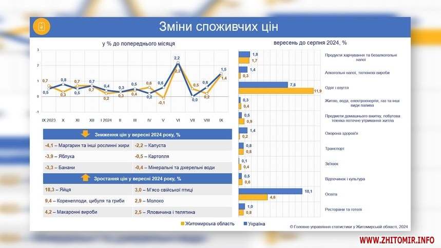 Як повідомляв Житомир.info, у серпні 2024 року в Житомирській області суттєво подорожчала капуста, а також зросли ціни на яйця, хліб, кисломолочну продукцію, макаронні вироби, борошно і крупи – на 3,3-2,0%.