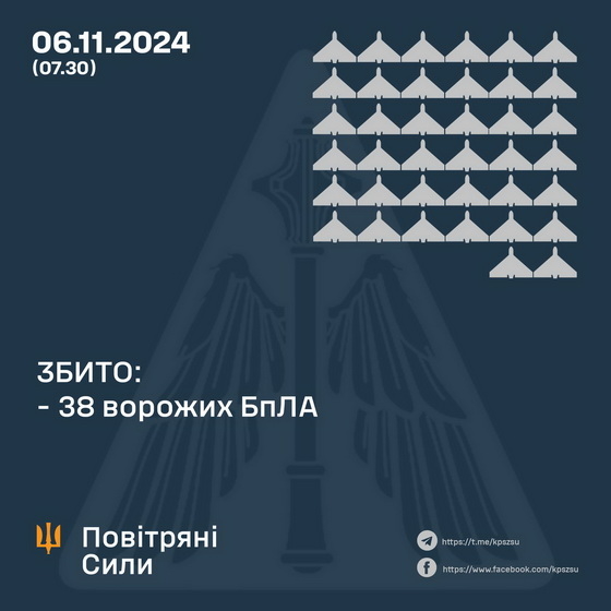 Над Україною в ніч на 6 листопада збили 38 ворожих БпЛА.