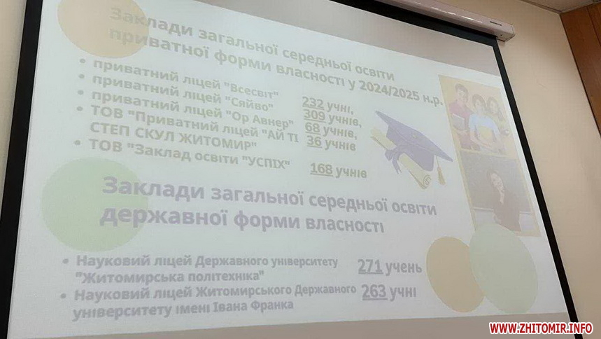 Щодо приватних закладів середньої освіти, яких у Житомирській громаді п’ять, то вони збільшили загальну кількість учнів до 1749. У 2024 році також збільшився набір до наукових ліцеїв при ЖДУ та політехніці, загальна кількість учнів 10-11 класів у цих двох ліцеях – 534.
