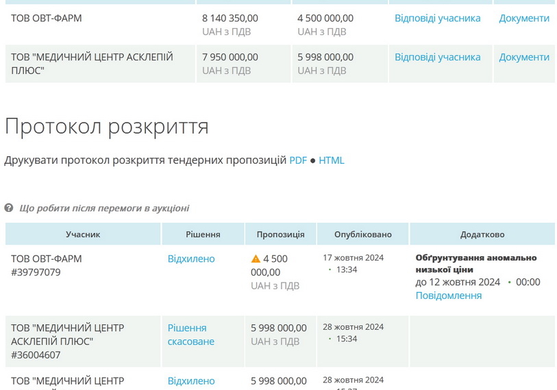 Торги оголошені повторно, на попередній тендер, який проходив 10 жовтня, заявки подали два учасники: ТОВ «ОВТ-фарм» відхилили через «аномально низьку ціну» - 4,5 млн грн, хоча стартова заявка була 8,1 млн грн; медичний центр «Асклепій плюс» вийшов на торги з пропозицією 7,95 млн грн, яку потім зменшив до 6 млн грн, але вчасно не підтвердив намір укласти договір з такою ціною.