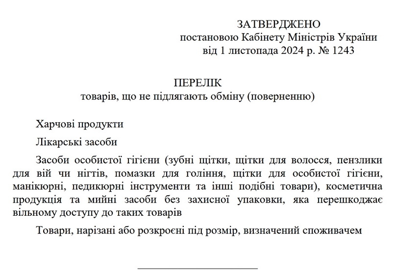 «Затвердити перелік товарів, що не підлягають обміну (поверненню), що додається. Визнати такими, що втратили чинність, постанови Кабінету Міністрів України згідно з переліком, що додається. Ця постанова набирає чинності одночасно з набранням чинності Законом України від 10 червня 2023 р. № 3153-ІХ «Про захист прав споживачів», але не раніше дня її опублікування», - йдеться у документі.